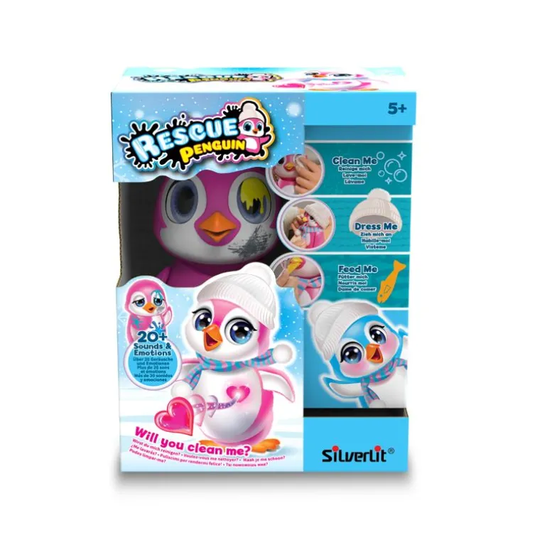Rescue Penguin trenger din hjelp! Dette er en søt interaktiv pingvin som du må ta vare på. Emballasjen tilbyr en morsom unboxing-opplevelse i tre trinn. Åpne opp boks nummer én som inneholder et magisk håndkle som utvider seg i vann. Bruk håndkleet til å tørke av pingvinen som er «skitten». Bak dør nummer to finner du et skjerf og lue som varmer opp den skjelvende pingvinen.