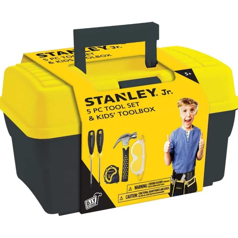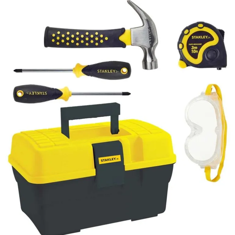 Stanley Jr gir deg det perfekte settet for små snekkere! Med i pakken får du beskyttelsesbriller med justerbar strikkreim slik at den passer de fleste barn, et målebånd som måler opptil 3 meter, en hammer, og 2 skrujern – stjerneskrujern og flat skrujern. Verktøyet oppbevares i den stilige verktøykofferten. Kofferten har et praktisk håndtak slik at det er enkelt å ta med seg.