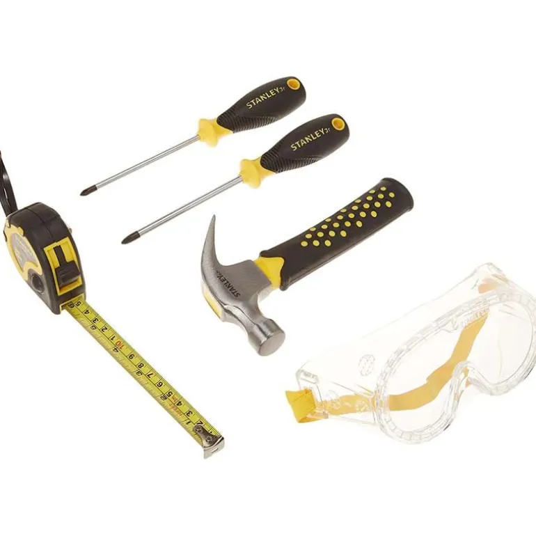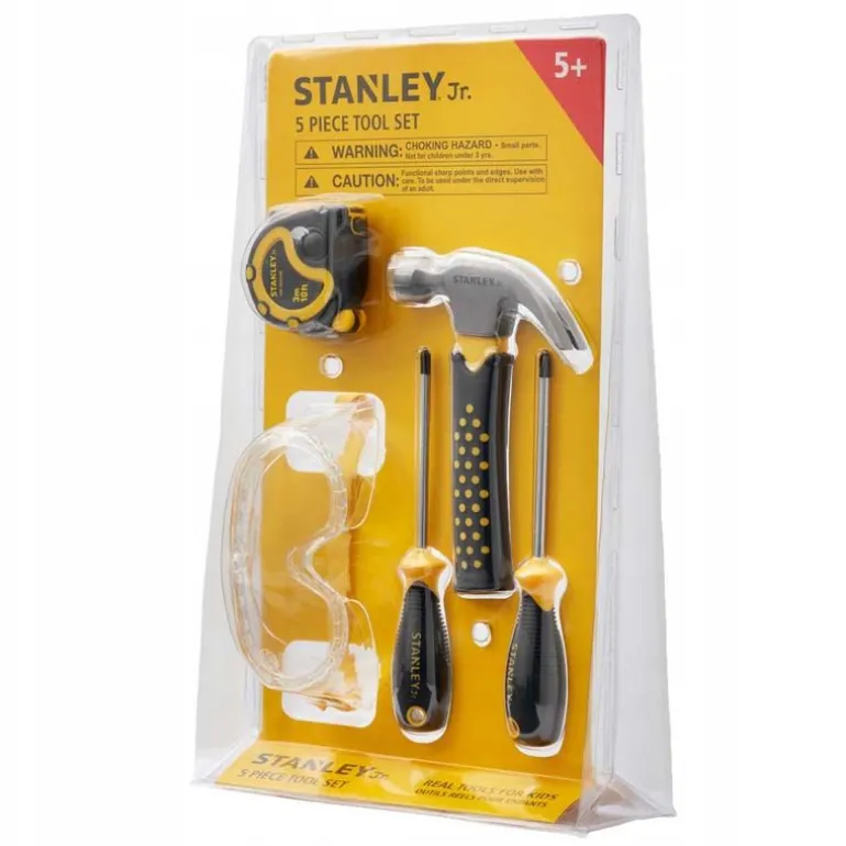 Stanley Jr gir deg det perfekte settet for små snekkere! Med i pakken får du beskyttelsesbriller med justerbar strikkreim slik at den passer de fleste barn, et målebånd som måler opptil 3 meter, en hammer, og 2 skrujern – stjerneskrujern og flat skrujern.