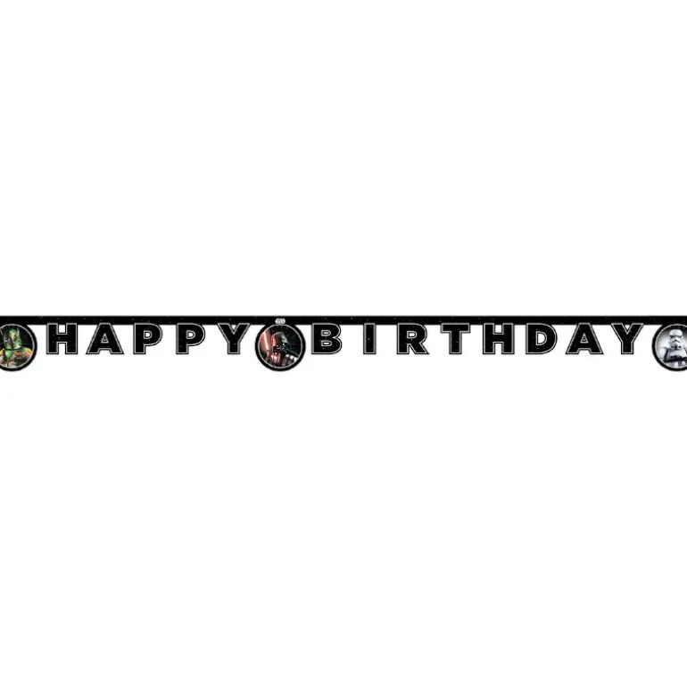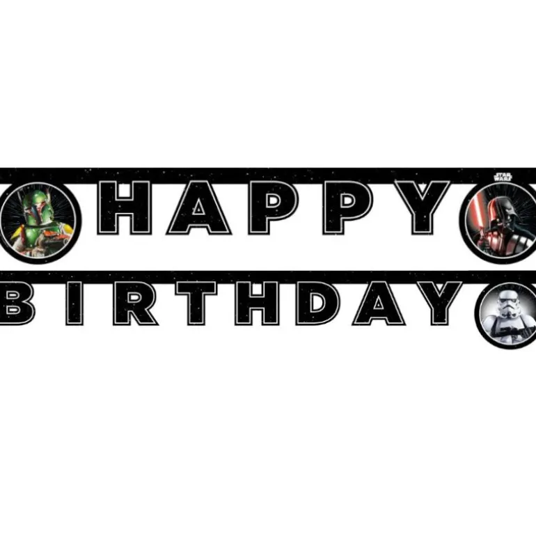 Dekorer til bursdagsfeiring for en Star Wars fan med dette Happy Birthday banneret med Star Wars motiv! Banneret måler 2 meter i lengde og festes enkelt med snorene eller teip.