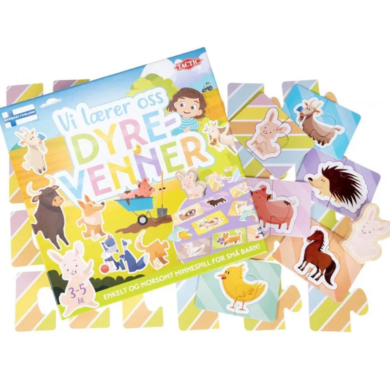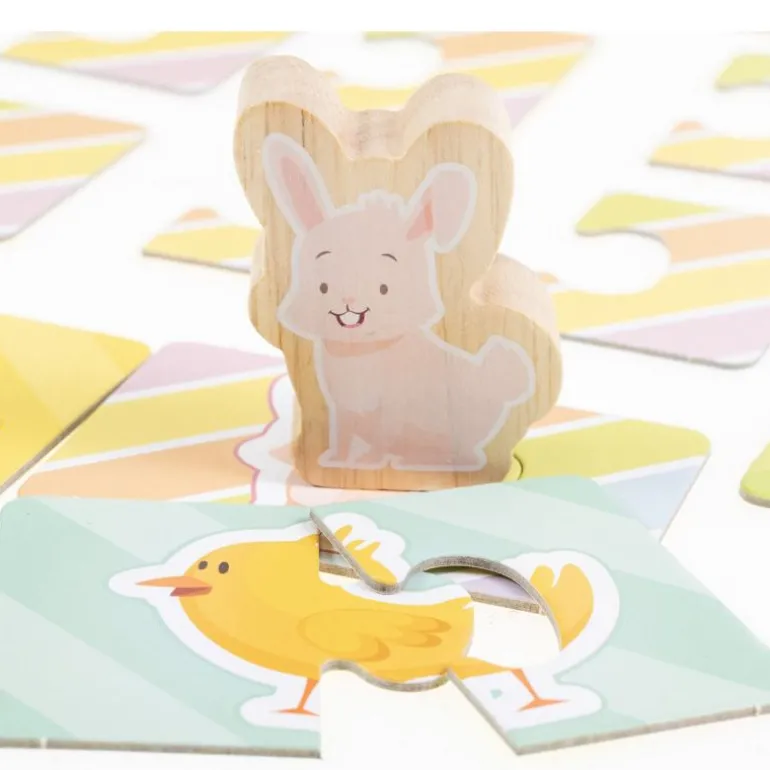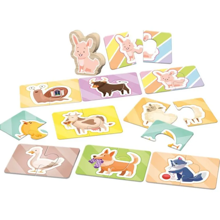 Finn delene for å lage alle dyrene! Del de to forskjellige typene deler på bordet, stokk dem og ta tur for å finne de to delene av hvert dyr. Hver gang du finner en kanin, hopper kaninfiguren i tre til deg – og hjelper deg kanskje med å vinne!