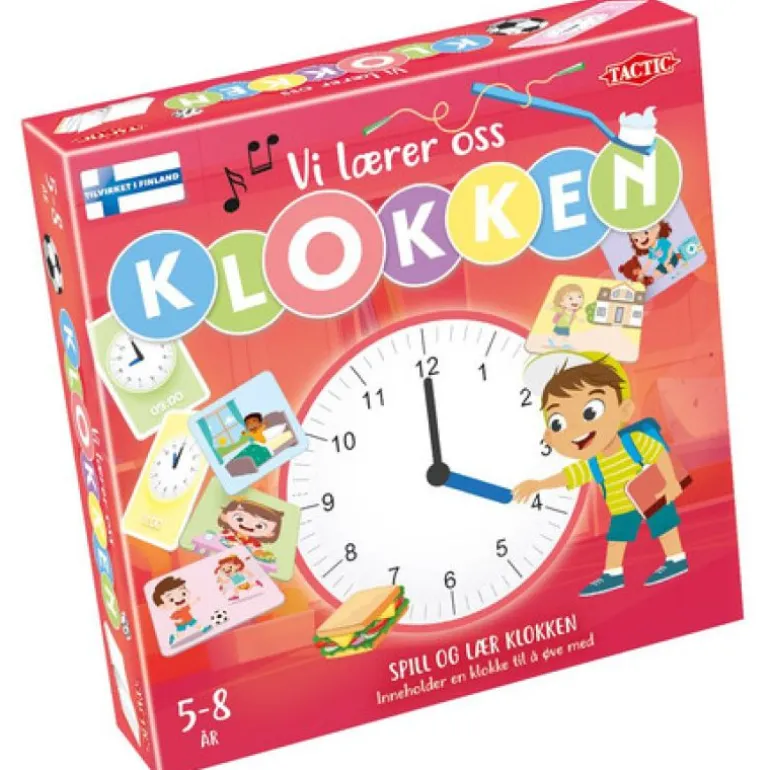 Lær klokka! Finn de riktige bildene for brettet ditt og drei klokkeviserne til riktig posisjon for å matche klokkeslettene på kortene!