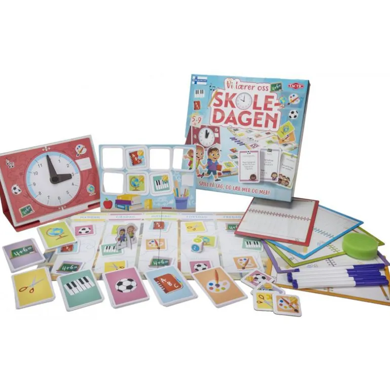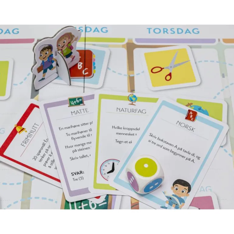 La oss leke skole! I dette spillet får selv de yngste spillerne se hvordan det kan være på skolen. Spillet inneholder oppgavekort fra sju forskjellige skolefag. Én spiller er læreren, mens de andre er elevene som skriver svarene sine på tavler som kan tørkes av. Samle én brikke fra hvert skolefag før klokkeviserne peker på tre.