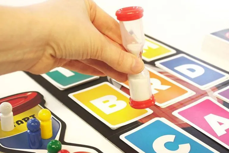 Legg ni bokstavkort på spillbrettet. Snu opp et kategorikort og sett i gang timeglasset! Du må komme opp med ord ved å bruke en av bokstavene,