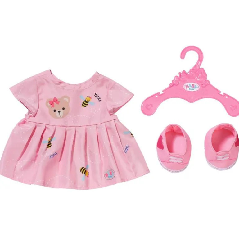 Bamse vil være søt i dag og har derfor på seg den rosa kjolen. Toppen har et trykk med et søtt bamsehode, som har en rosa sløyfe i håret. På resten av kjolen er det små bier som kretser rundt. I tillegg har bamsen på seg rosa sko med påtrykte hvite lisser og en rosa silhuett av et bamsehode ved ankelen. Passer perfekt på alle Baby Born Bjørn bamsene, akkurat som BABY born dukkene i størrelse 43 cm. Klær av høy kvalitet til BABY born bamsen og BABY born dukker 43 cm. For enda mer, variert og langvarig lekeglede.