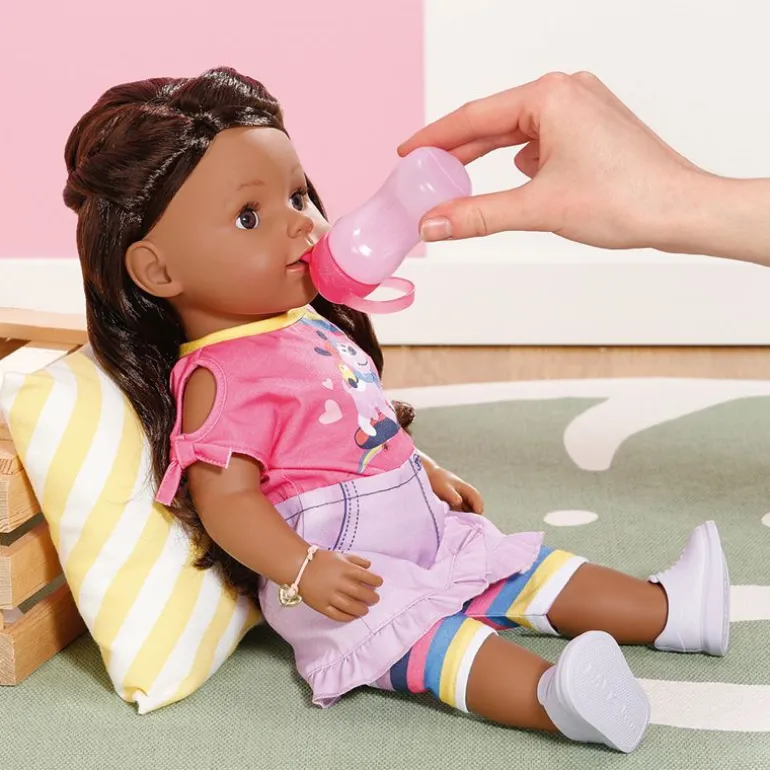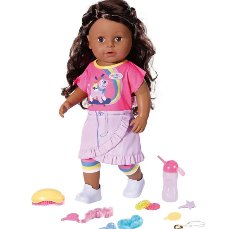 - Inkludert: Baby Born Sister dukke med brunt hår, flaske, hårbørste, 2x klemmer, 2x hårforlengelser, 2x hårstrikker, armbånd, og smykke.