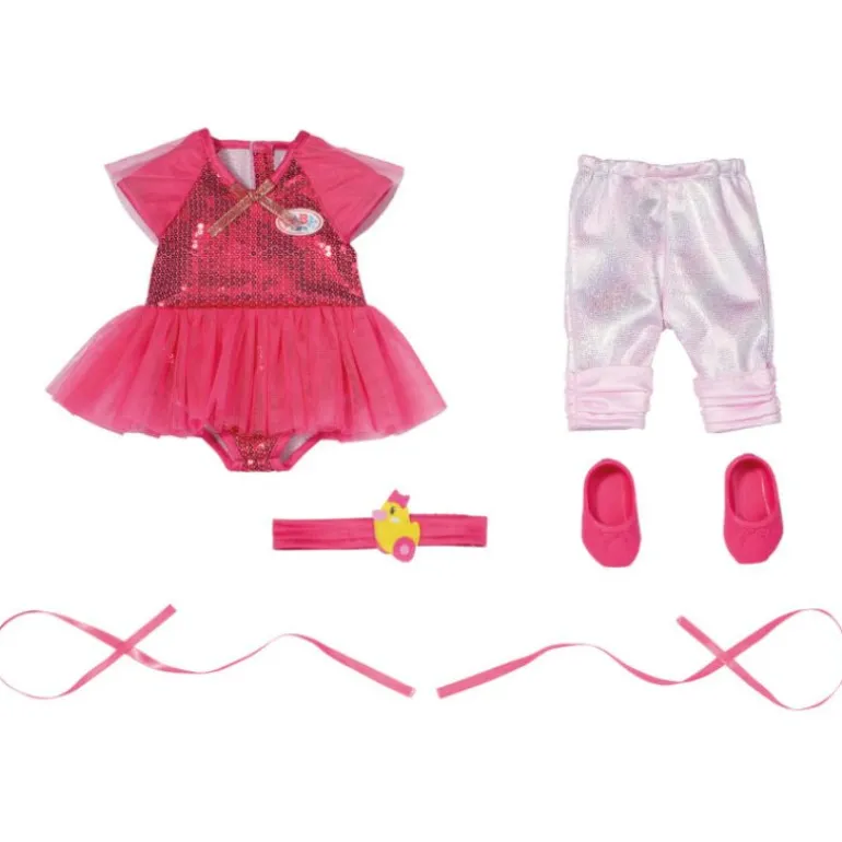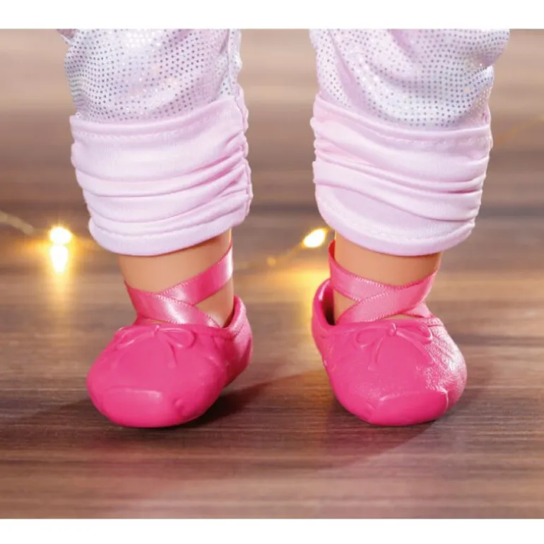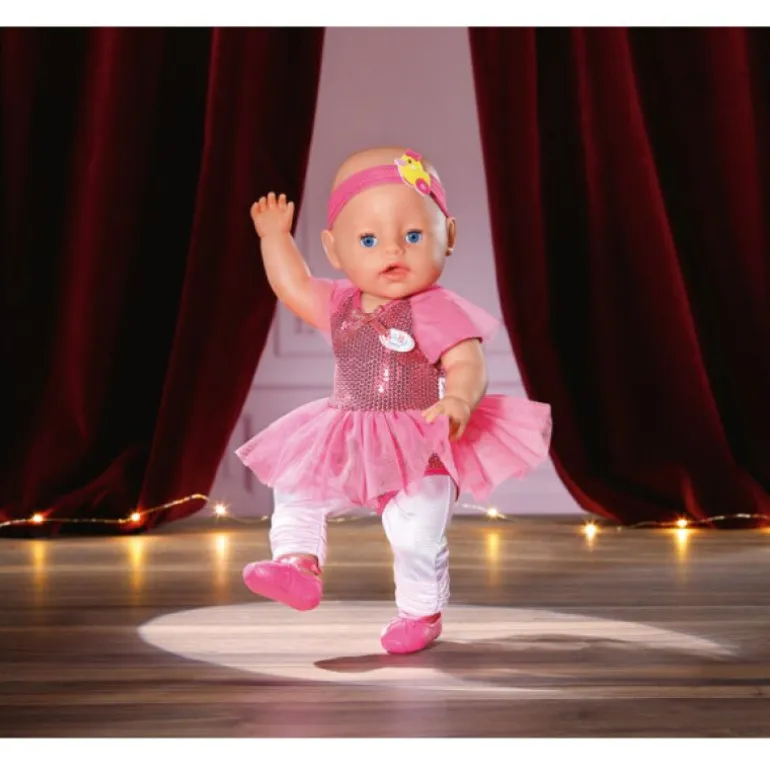 Det er strenge regler på balletten. Trikoten skal sitte ordentlig, tutuen skal være nystrøket, og håret skal settes opp i en presis knute. Ikke noe problem for BABY born… Den rosa bodyen hennes er dekorert med glitrende paljetter. Den har gjennomsiktige ermer og en sløyfe i halsen. Tutuen er sydd på trikoten slik at den blir der den hører hjemme når hun hopper og tar piruetter. I tillegg har den lille ballettstudenten på seg skinnende ballettleggings og rosa ballerinasko med de typiske lissene.