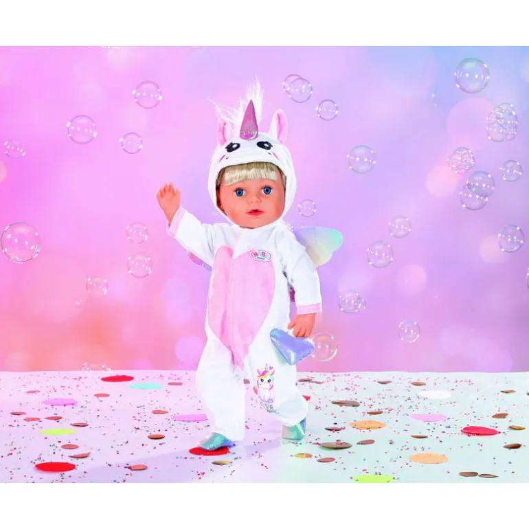 BABY born elsker rett og slett å kle seg ut. Akkurat nå er enhjørningsdrakten hennes favorittantrekk. Når hun har den på seg, drømmer hun om et land langt unna med magiske feer og gåtefulle enhjørninger. Hetten på den hvite drakten er designet for å se ut som hodet til en enhjørning. Over det søte ansiktet hennes stråler et glitrende horn mellom de søte små ørene, mens en hvit man faller ned fra toppen av hodet hennes.