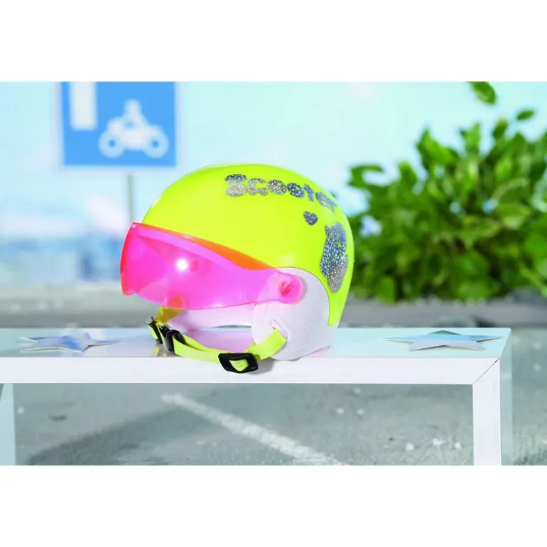 Sikkerheten er alltid viktig, også for Baby Born. Når hun skal ut på scooteren eller sykkelen sin trenger hun selvsagt en hjelm. Denne flotte hjelmen kommer i en gul farge med glitrende detaljer i sølv.
