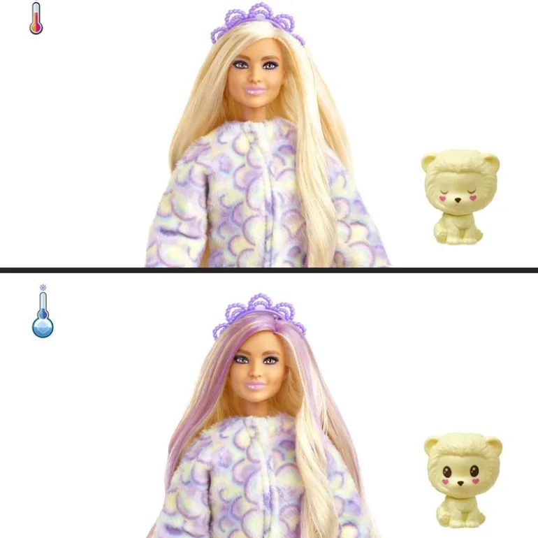 Åpne opp pakken for å finne en Barbie -dukke gjemt inni et løvekostyme sammen med en søt matchende mini løve! Barbie -dukken har langt farerikt hår som matcher kostymet. Kostymetoppen kan vrenges og brukes som en varm og supermyk fleecejakke. Selve kostymehodet fungerer også som en herlig seng til din nye søte mini løve. Kaldt vann vil endre hårfargen slik at Barbie får lilla striper i håret og øyene til mini løven vil lukke seg. Endre tilbake ved bruk av varmt vann. I de 4 overaskelseposene kan du finne blant annet et lyselilla satengskjørt, et par med sko, en hårbøyle, og en kam.