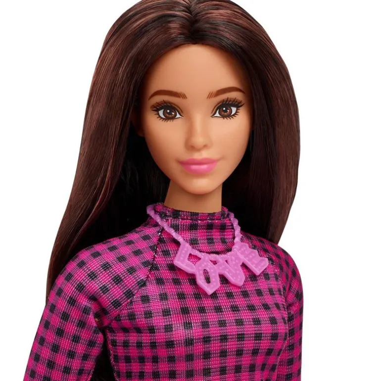 Denne Barbie dukken har på seg en flott rosa og svart kjole med rutemønster, rosa matchende smykke, og et par rosa sko. Dukken har mykt, brunt hår i en middels lengde som kan styles. Kombiner gjerne med andre Fashionista dukker for å lage din helt egen stil!