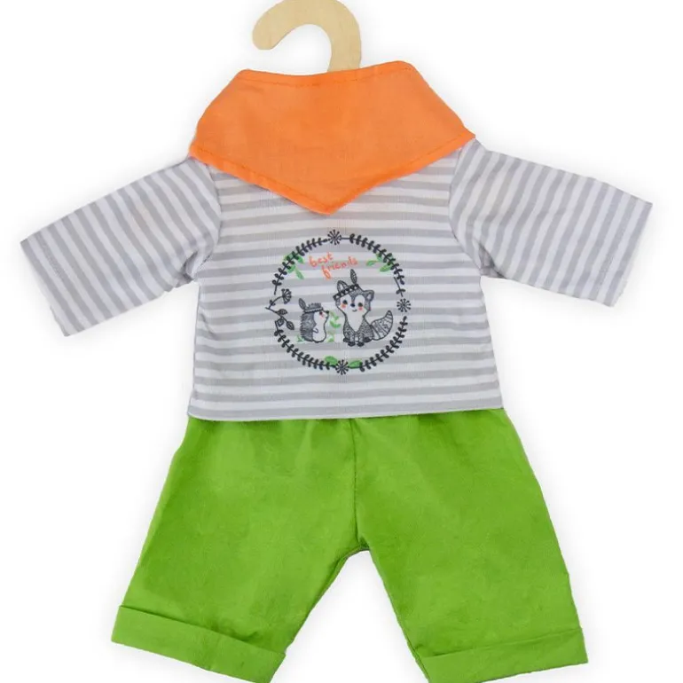 Stilig stripete genser med flott motiv fra Heless. Det følger med et par tøffe grønne bukser og et oransje skjerf. Genseren kommer med borrelås slik at den er enkel å ta på og av. Det følger med en kleshenger slik at du kan henge den opp når den ikke er i bruk.