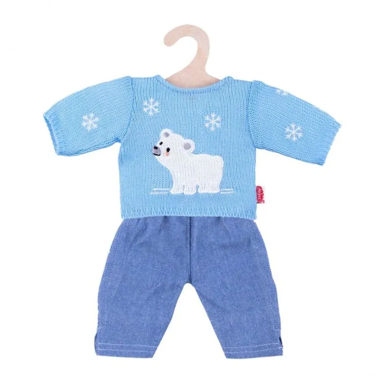 Kle opp dukken din i dette flotte antrekket. Den herlige genseren i lyse blå kommer med et søtt motiv av en isbjørn og snøfnygg. Med den matchende blå dongeri buksen er baby-dukken klar til å dra ut for dagen. Genseren har borrelås på baksiden og buksen har strikk i seg slik at det er lettere å ta det av og på dukken. Det følger med en kleshenger i tre slik at du kan henge klærne opp etter bruk.
