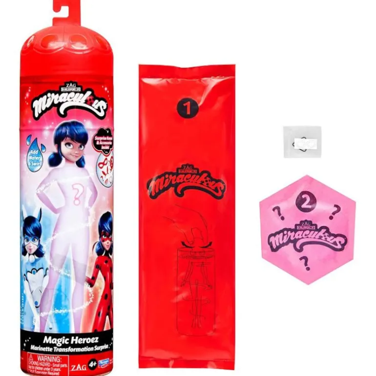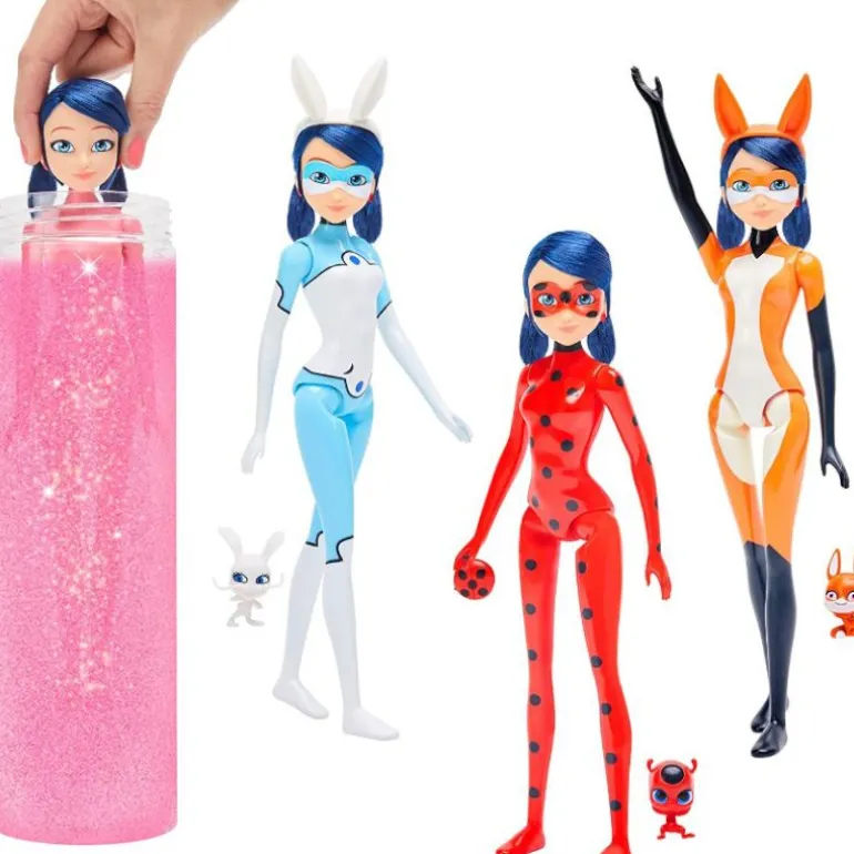 Opplev forvandlingsmagien fra Miraculous: Tales of Ladybug and Cat Noir med denne søte avsløringsdukken. Med bare litt vann lar disse Miraculous lekene Marinette forvandle seg til et av heltekostymene hennes og avsløre matchende tilbehør. Hver dukkes utseende forblir et mysterium inntil det avsløres! Disse Miraculous Ladybug og Cat Noir-lekene kommer i en plastbeholder i blindposer, hver Marinette-dukke har et hvitt skimmer som dekker for å bevare overraskelsen. Fyll beholderen med vann og plasser dukken inni for Ladybug magi avsløring.