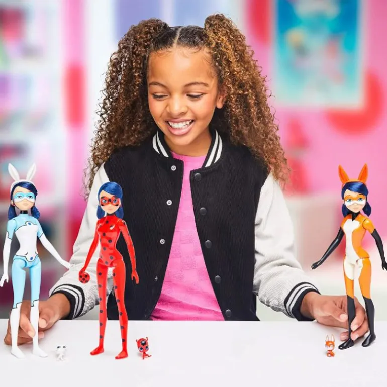 Med hver Miraculous Ladybug dukke er det også en ekstra blindpose med en shimmer ball som inneholder tilbehør. Senk skimmerkulen i vann for å avsløre den matchende masken og Kwami, samt ett ekstra tematilbehør som er unikt for hvert kostyme. Samle Marinette i de forskjellige kostymene hennes med disse Mirakuløse Ladybug-figurene du kan leke med eller vise frem.