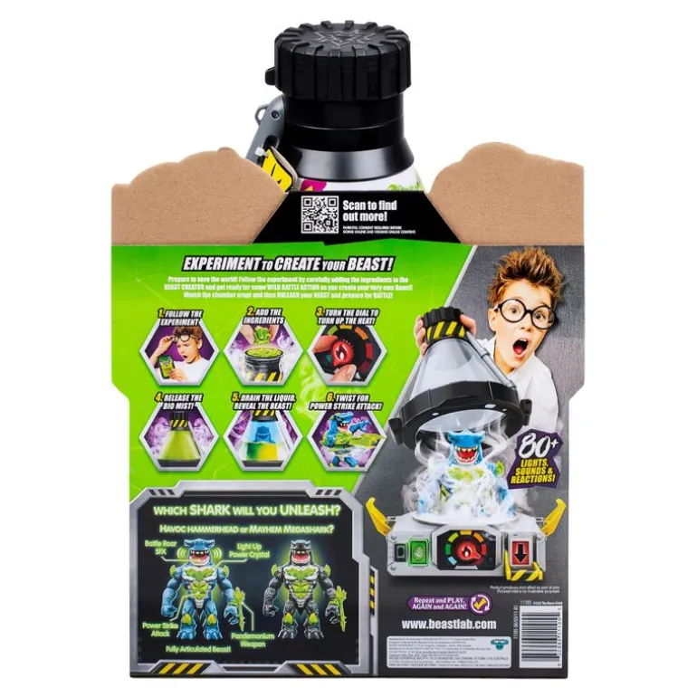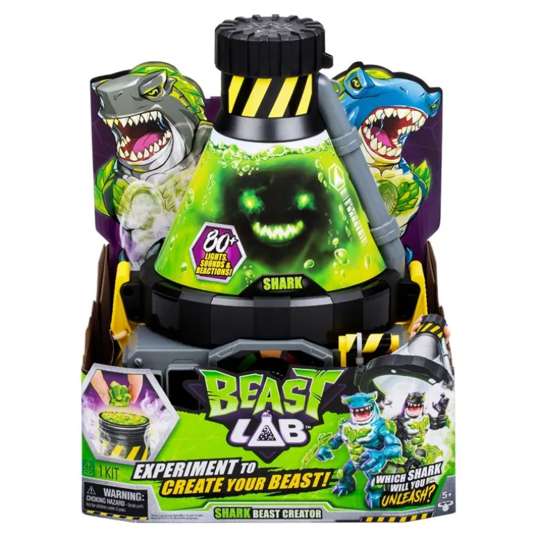 Har du det som skal til for å redde verden? Verden er i fare, og den eneste måten å beskytte den på er med et beist! Gjennomfør et eksperiment med Beast Creator for å lage en av to haier! Hvilken hai vil slippes løs fra Beast Lab? – Blir det Havoc Hammerhead eller Mayhem Megashark? Beast Lab er utstyrt med 80+ lys- og lydeffekter som bringer eksperimentet til live. Barna har det endelige ansvaret og må legge til de riktige målene av nøkkelingredienser: Attack Serum, Roar Rocks, Fossil Fragments og Skin Scraps i karet!
