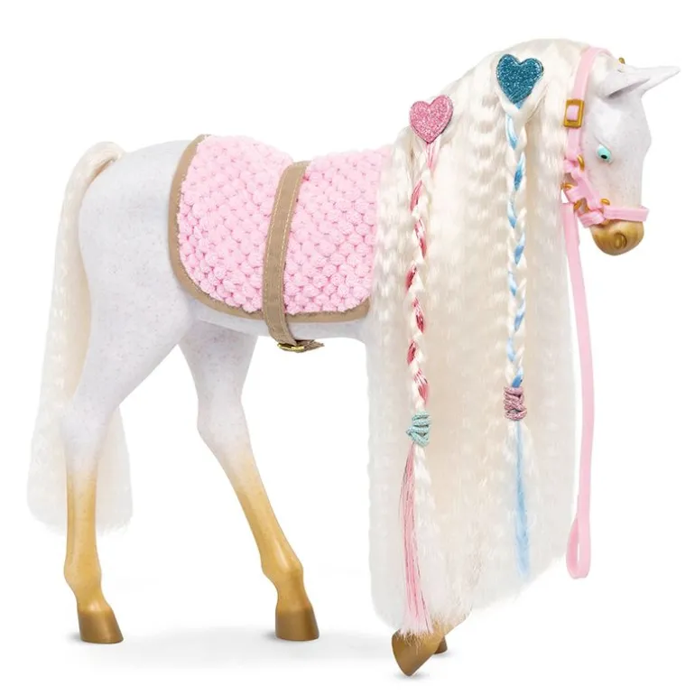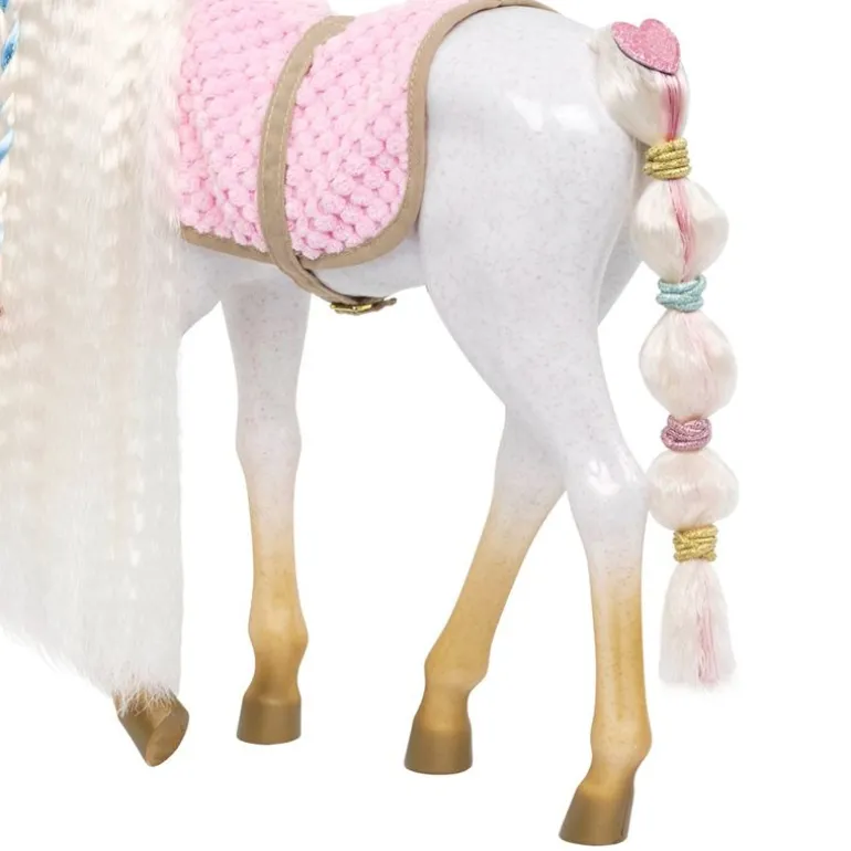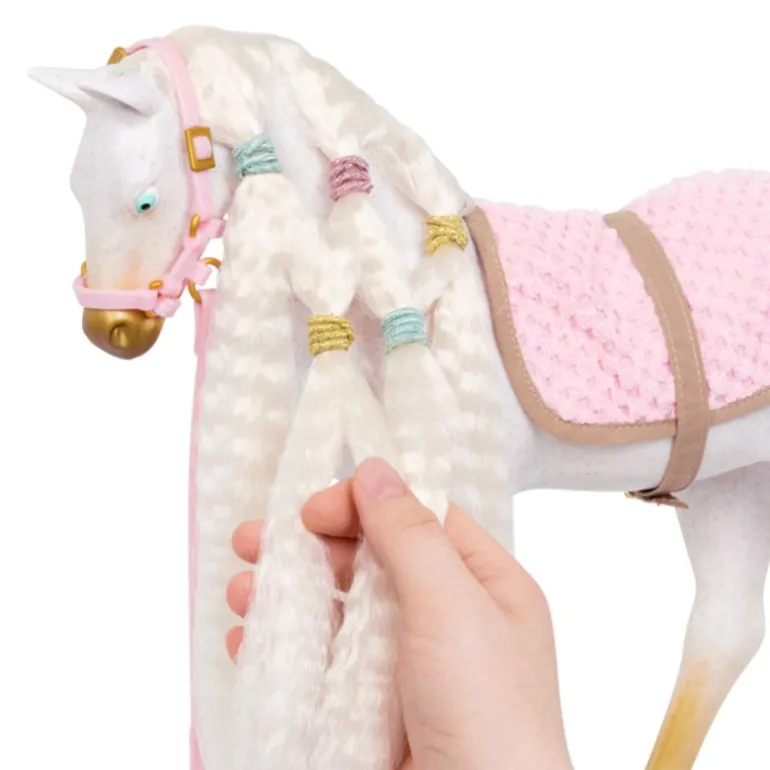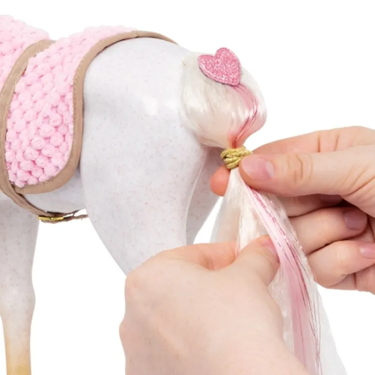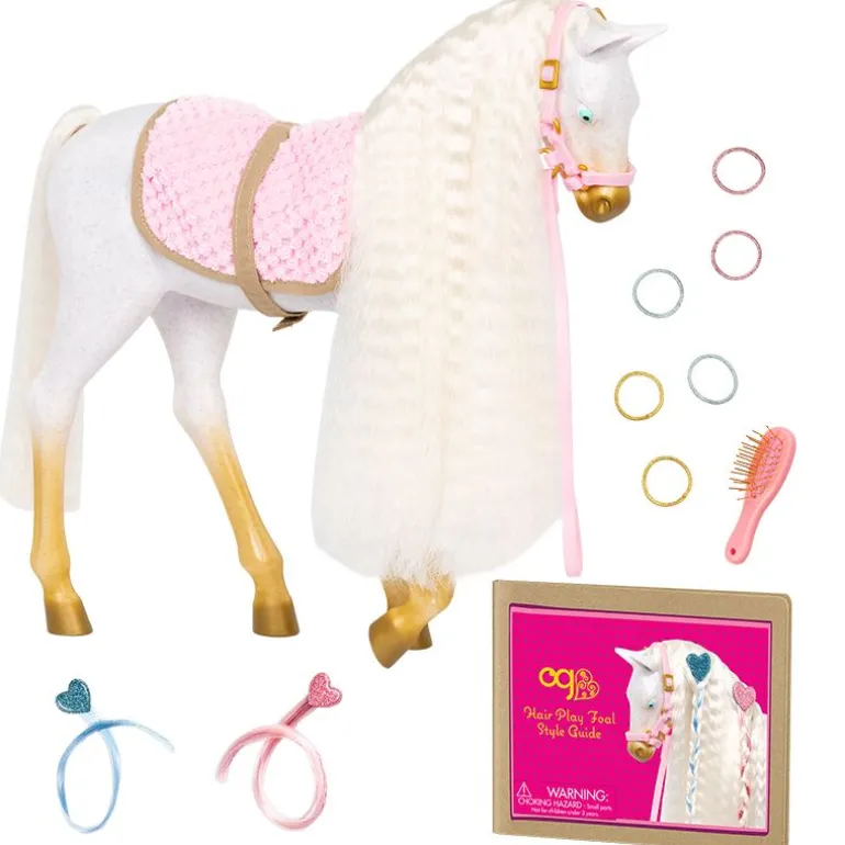 La kreativiteten din skinne med Our Generation Andalusier føllet! Denne 30 cm stylinghesten har en hvit kropp med gylne føtter, en ultralang hvit man og hale, og har fargerikt tilbehør for å legge til majestetiske frisyrer. Start med å børste manen og halen og pynt med de hjerteformede hårforlengelsene. De festes enkelt til hestens mane eller hale! Følg stylingheftet for å lære hvordan du gir føllet ditt de peneste flettene og hestehalene, og bruk de fargede strikkene til å lage lyse mønstre! Så ta tak i heste-bestevennen din og hopp på den behagelige rosa salen for å galoppere gjennom landskapet med stil!