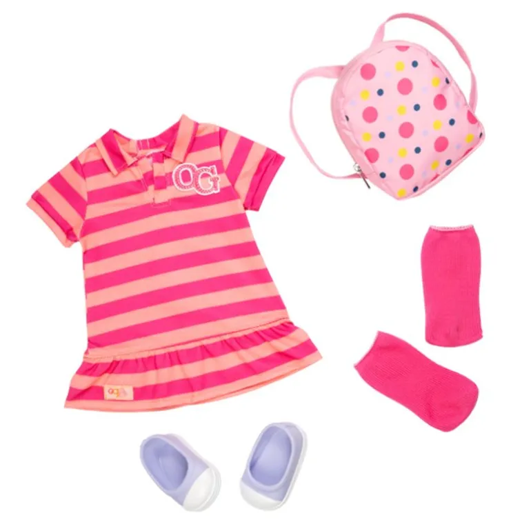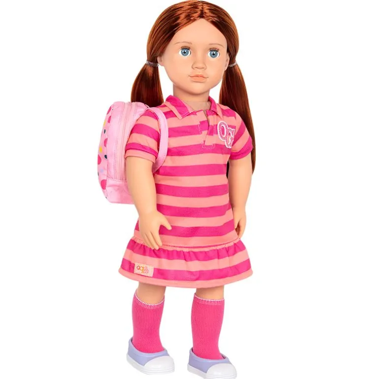 Gjør Kimmy klar for hennes første dag på Awesome Academy! Denne Our Generation 46 cm dukken har knallblå øyne som åpnes og lukkes, og det lange røde håret hennes er morsomt å børste og style før hun drar til skolen! Kimmy kan rotere nakken, armene og bena for enkelt å skifte antrekk. Hun har på seg en søt, stripet kjole i rosa nyanser med OG-emblem, matchende knehøye sokker og komfortable sko. Pakk Kimmy’s essensielle skolemateriell i ryggsekken dekorert med fargerike prikker. Den åpnes lett med glidelås og hviler komfortabelt på skuldrene hennes når hun reiser til timen! Kimmy’s antrekk har lettåpnede lukkinger som gjør det raskt å ta på og av, så Kimmy kan prøve mange søte stiler som passer for hver skoledag!