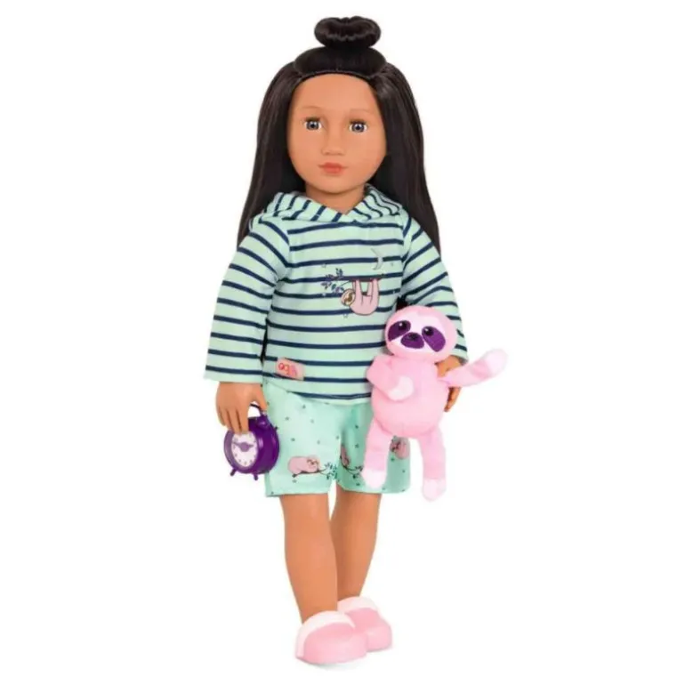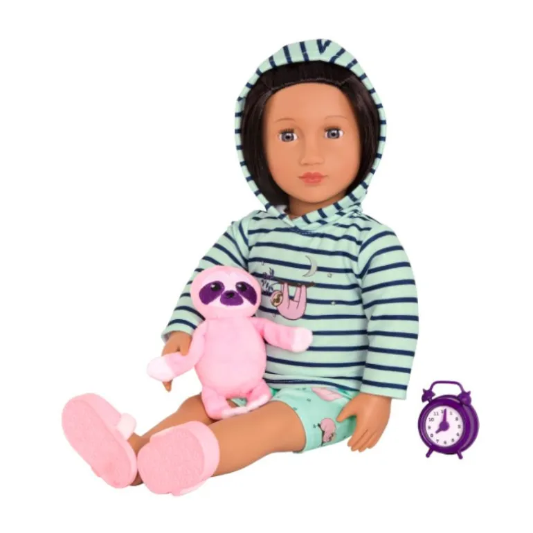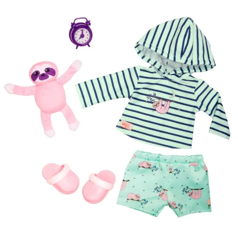 Dukken din kommer til å ha søte drømmer med det flotte Our Generation dovendyr-antrekket! Den stripete, langermede gensern med hette har et søtt motiv av et rosa dovendyr foran, og de bedårende pyjamasshortsene er fulle av søte dovendyrdesigner. De komfortable tøflene vil holde dukkens tær varme, og den myke dovendyr bamsen er den perfekte sovevennen. Den kommer til og med med en vekkerklokke som lar deg endre tiden med skiven, slik at du kan gi dukkene beskjed når det er på tide å stå opp. Dette antrekket er enkelt å ta av og på, som gjør det morsomt å mikse og matche med andre fargerike Our Generation-antrekk, slik at dukken din kan starte dagen med kreativ stil!