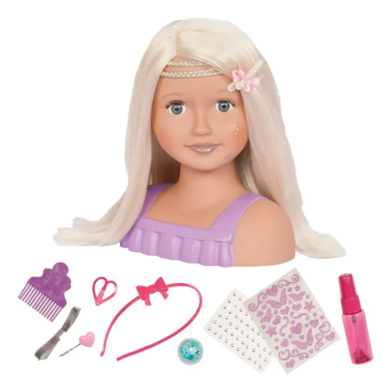 Lag flotte krøller, legg flair til håret og dekorer med glitter! Trista kommer med et utvalg av flotte hårtilbehør som pannebånd, hårklemmer og sløyfer, en kam og sprayflaske for å hjelpe til med å løse opp, og 3 sider med glitter og edelstensklistremerker for å gi stilen hennes ekstra glans. Det medfølgende frisyreheftet har instruksjoner for hvordan du lager tre forskjellige unike frisyrer – og med fantasien din kan du lage mange flere! Prøv stilene på Trista og gjenta dem på deg selv! Denne dukkebysten er det perfekte stedet for å teste ut dine glitrende ideer. Hun elsker å endre utseende med din hjelp!