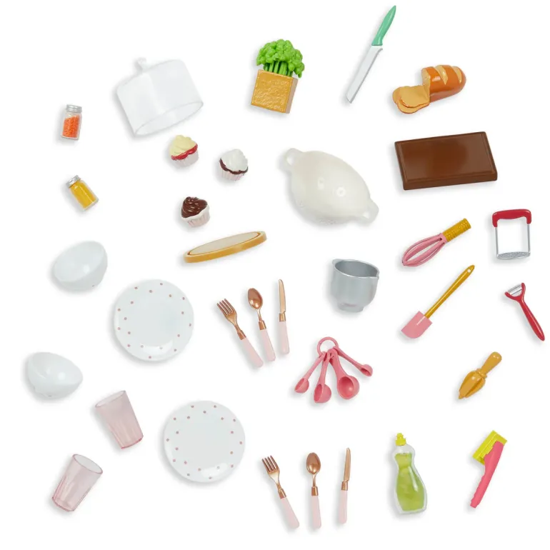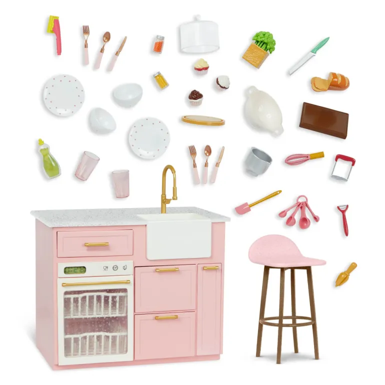 - Inkludert: Kitchen island, barstol, skjærebrett, potetskreller, moser, presse, 2 krydderkrukker, et stykke brød, såpeflaske, basilikumplante, svamp, beholder, 3 muffins, bakesett, dørslag, 2asjetter, 2 skåler, 2 kopper og bestikk