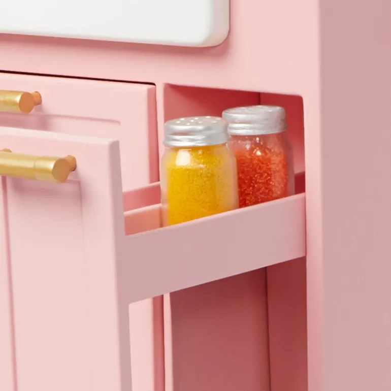 - Morsomme funksjoner: Innebygd oppvaskmaskin som spiller 3 lyder, stativer som slider ut, og skap som åpner for åorganisere asjetter, bestikk og krydder.