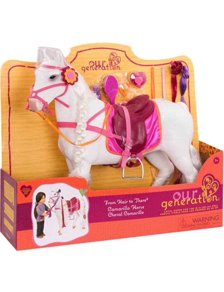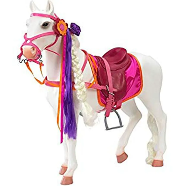 Møt denne flotte hesten som dine Our Generation dukker kan ri på. Hesten har bevegelige bein, og lang man som du kan gre. Med i settet følger masse tilbehør som kan brukes til å stelle og pynte hesten som farget bånd, rosa og lilla striper til manen og klemmer. Hesten er 49 cm høy, og ca 48 cm lang. Dukke, hestehenger m.m. selges seperat.Passer fra 3 år+N