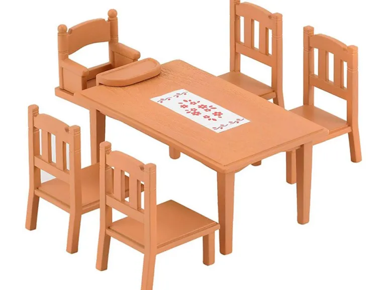 Gi barna en fortryllende lekeopplevelse med Sylvanian Families spisebord og stoler møbelsettet! Dette settet inneholder alt du trenger for å skape et koselig spiseområde i ditt Sylvanian Families hjem. Med et elegant bord, fire matchende stoler og en liten stol som henger på bordet for Sylvanian babyene, kan figurene dine samles rundt bordet for koselige måltider og familietid.